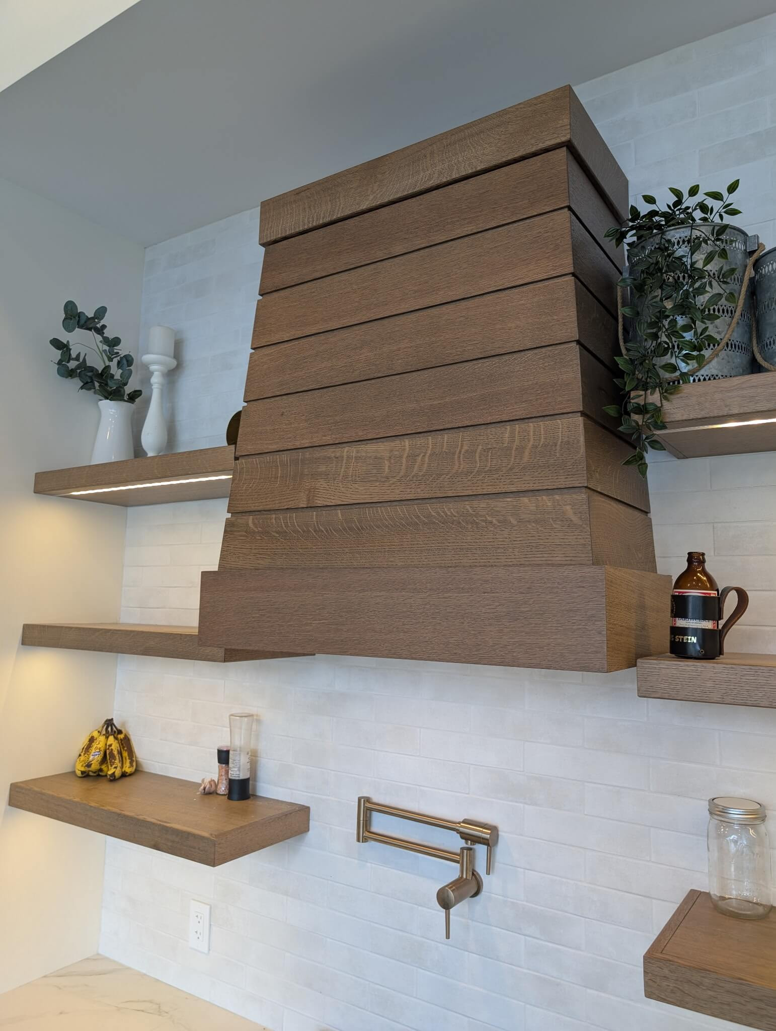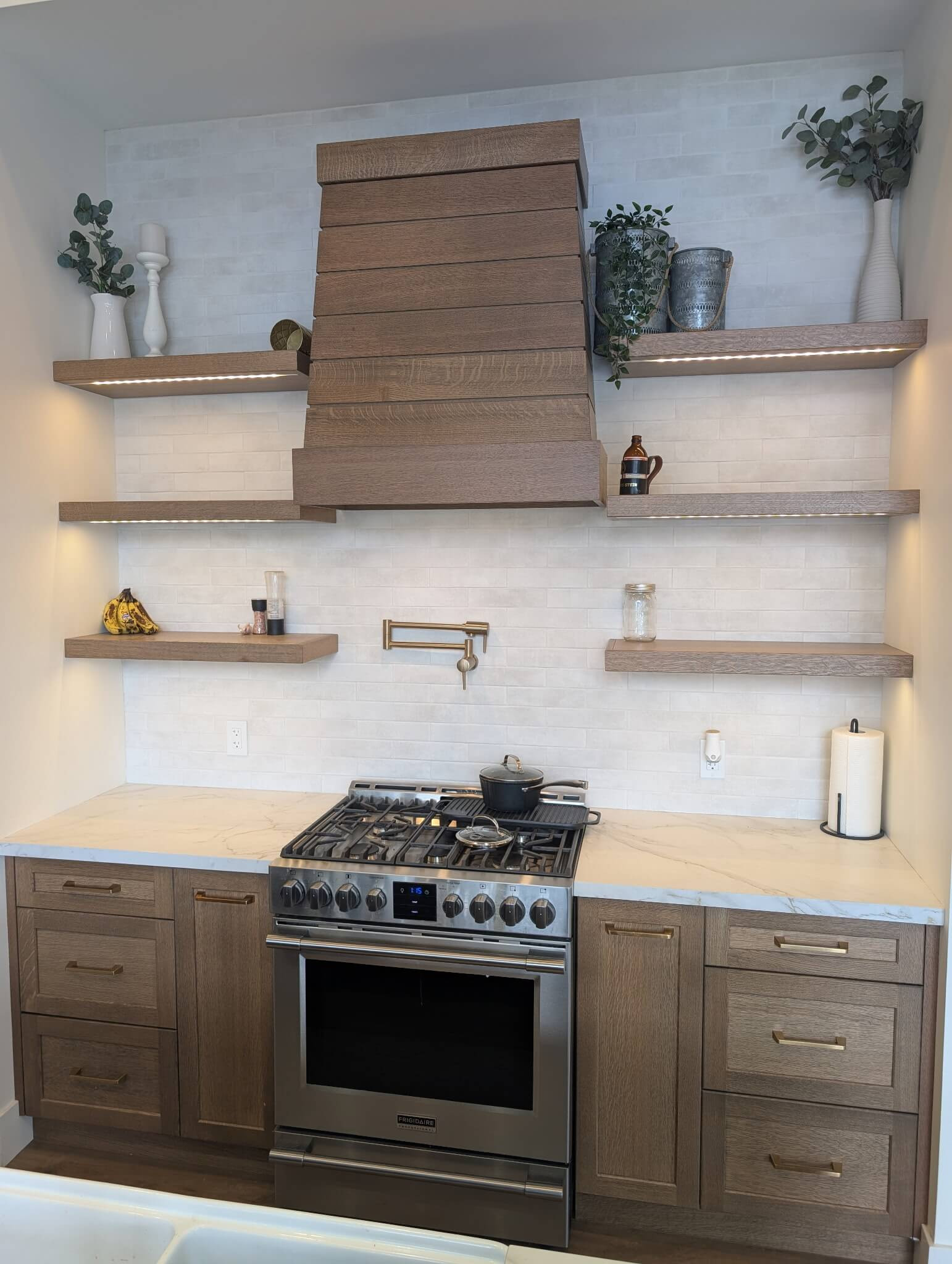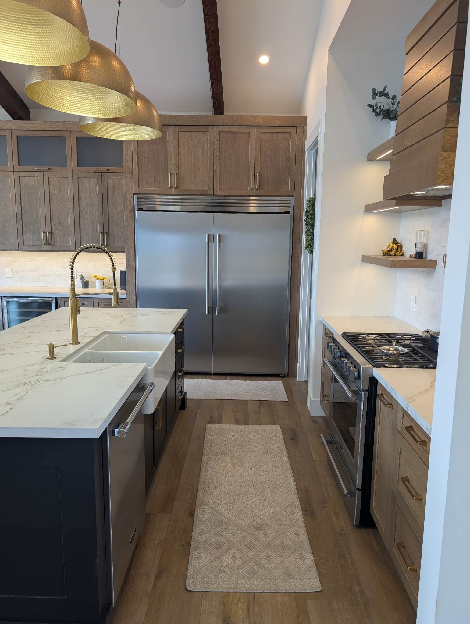 Soaring ceilings, rich textures, and thoughtful finishes define this standout kitchen. Warm oak cabinetry is paired with a bold black island and brushed gold accents for a look that’s equal parts cozy and contemporary. The veined quartz countertop and open shelving add a touch of luxury while keeping things light and functional—perfectly suited for everyday living or elegant entertaining.